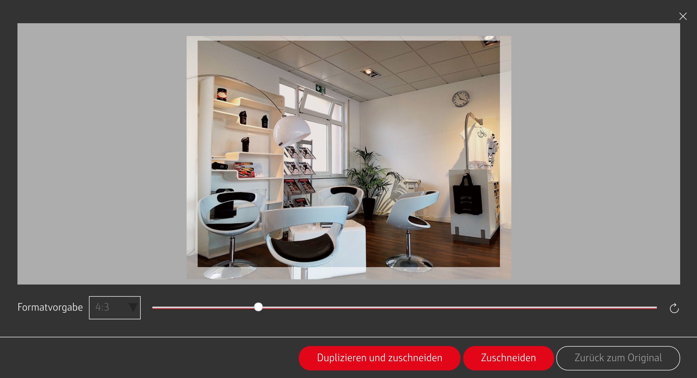 Mit dem Regler neben der Formatvorgabe kannst Du das Bild vergrößern und verkleinern. Ist das Bild größer als der Ausschnitt, kannst du das Bild mit gedrückter Maustaste hin- und herbewegen.