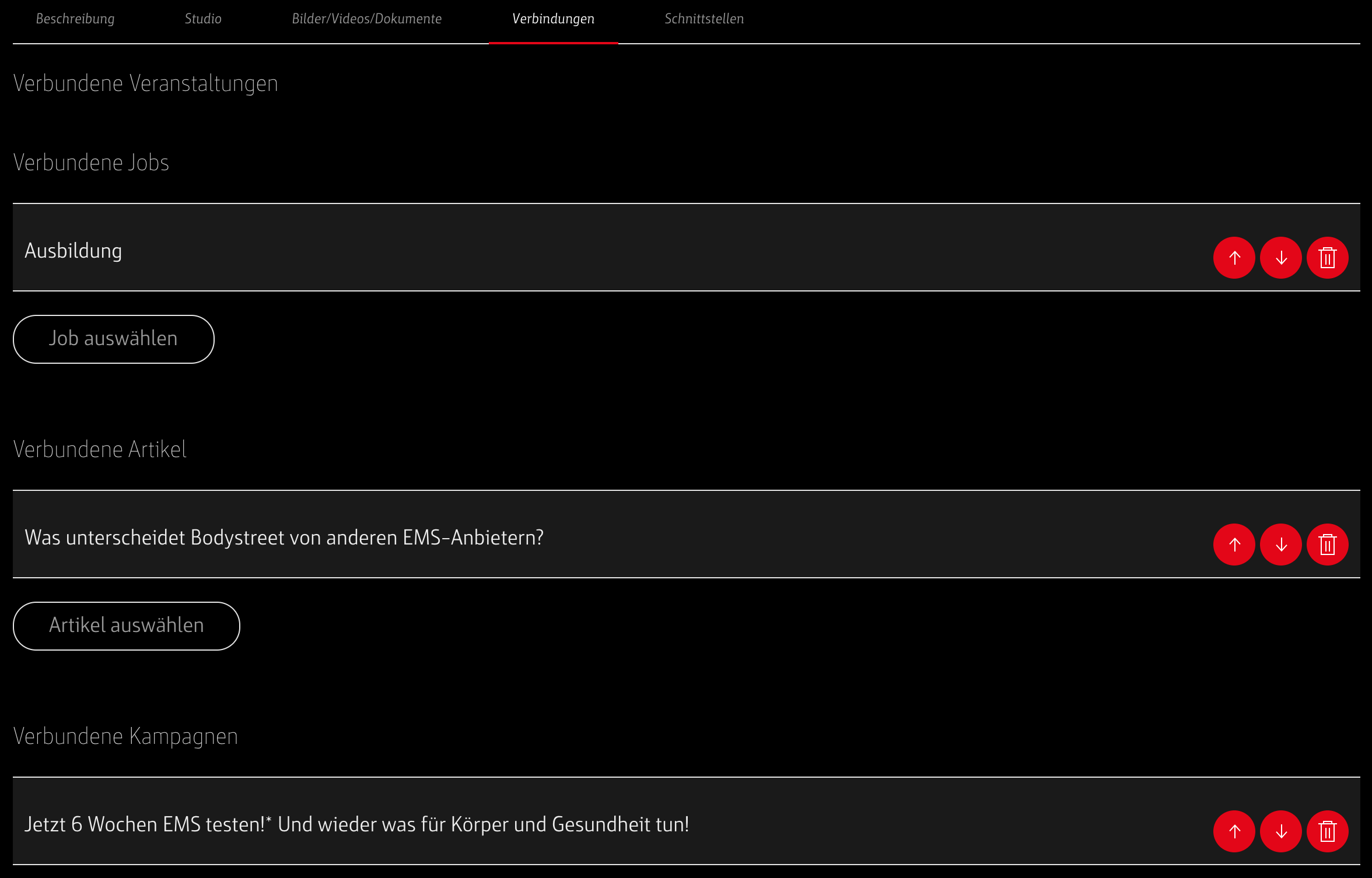 Je nachdem, welche Events, Jobs, Kampagnen oder News-artikel bereit gestellt werden, kannst du aus der Liste ein Element auswählen. Es erscheint dann in den Verbindungen. Wenn du mehrere Elemente hinzufügen möchtest kannst du den Dialog wieder mit öffnen.